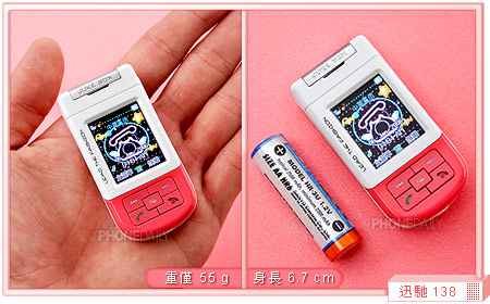 Размеры телефона составляют 65×37 × 22 мм, вес — 59 г. Аппарат настолько удобно лежит в кармане, что его практически не замечаешь. В руке его также практически не видно, так как изначально он рассчитан на тонкие и изящные дамские пальчики.